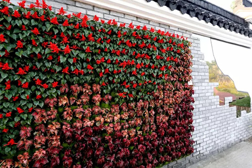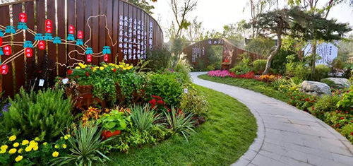 考慮到銀川的干燥氣候,垂直綠化墻植物的保濕成為難題。“浙江園”垂直綠化墻以無(wú)紡布為墻體材料,使用保濕性強(qiáng)的基質(zhì),優(yōu)選植物種類,同時(shí)搭配滴灌系統(tǒng),保證了綠化墻鮮花擁簇的景象。展園內(nèi)的垂直綠化墻設(shè)計(jì)簡(jiǎn)潔、曲線優(yōu)美,與以錢塘江文化為主題的背景墻相互映襯,共同展現(xiàn)了新時(shí)期浙江園林景觀的不斷發(fā)展與創(chuàng)新。