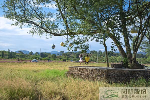 西側(cè)的連片稻田區(qū)域是花花世界主題園。該區(qū)以彩色油菜花、彩色麥、彩色水稻等彩色農(nóng)作物為主,營(yíng)造爛漫的七彩農(nóng)田。該區(qū)還建有開(kāi)闊的觀景平臺(tái),可以遠(yuǎn)眺七彩田園的美麗風(fēng)光,村民們還可以在此開(kāi)展小型活動(dòng),如跳廣場(chǎng)舞等。為增加人與景觀的互動(dòng),豐富田園色彩,在建設(shè)時(shí)鋪設(shè)了田間綠道,兩側(cè)種植的粉黛亂子草猶如粉色花海。部分綠道兩側(cè)種植柿子樹(shù)、銀杏等觀果、觀葉樹(shù)木,既可以為夏日的道路遮蔭,又能營(yíng)造更加豐富多彩的觀景體驗(yàn)。